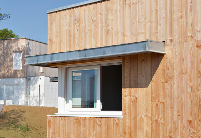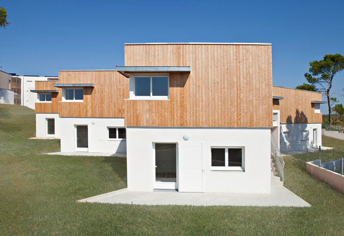 Construction au Sud de la parcelle de 9 maisons en bois jouant avec la pente du terrain et laissant libre la vue pour les logements collectifs.